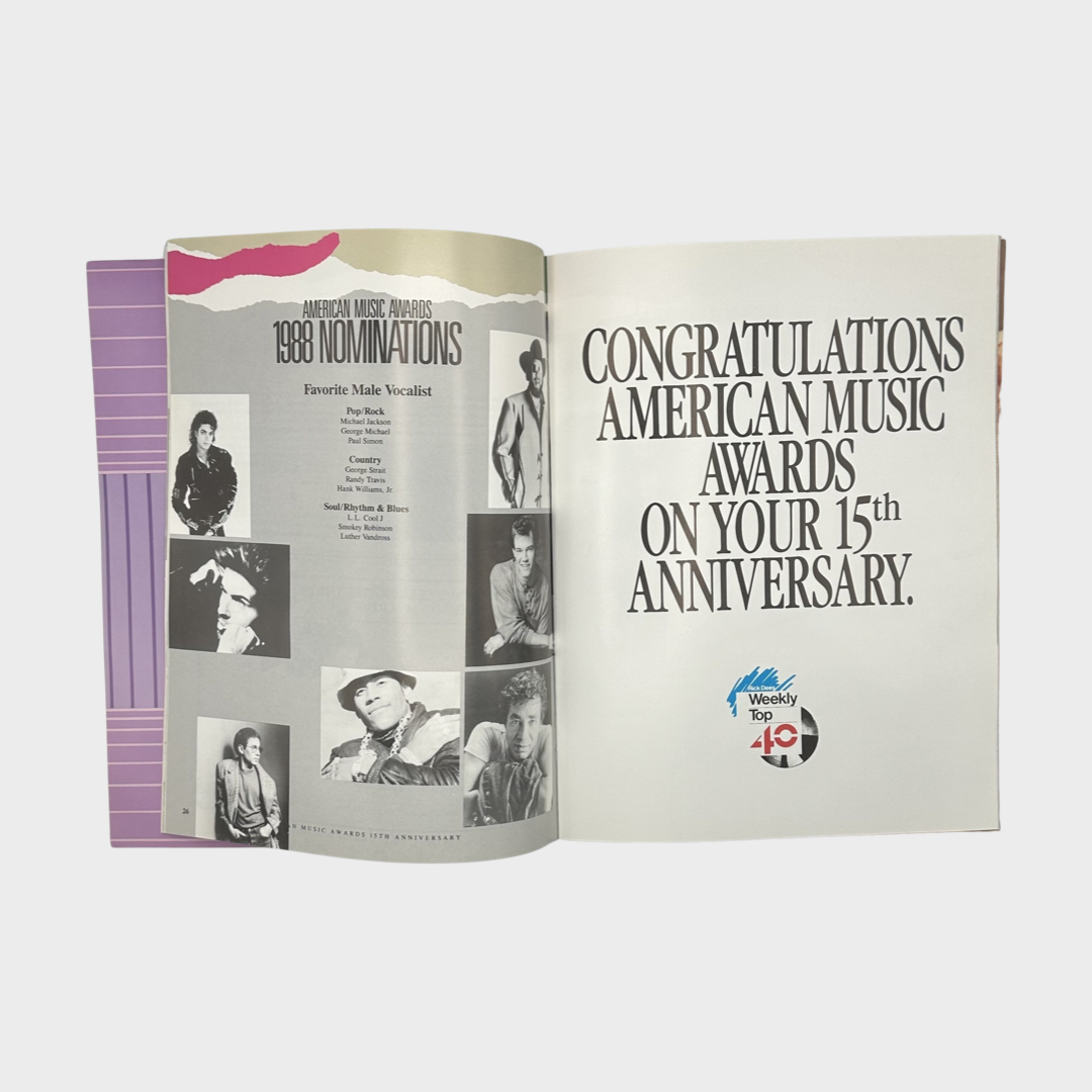 Description:Original Program from the 15th Annual American Music Awards held on January 25, 1988 at the Shrine Auditorium in Los Angeles. Michael Jackson was nominated for Favorite Pop/Rock Male Artist.
